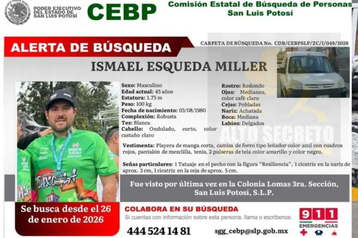 La Comisión Estatal de Búsqueda de Personas de San Luis Potosí confirmó que Ismael Esqueda Miller, de 45 años, fue visto por última vez en la colonia Lomas Tercera Sección, sin que hasta el momento se tenga información clara sobre lo ocurrido después.