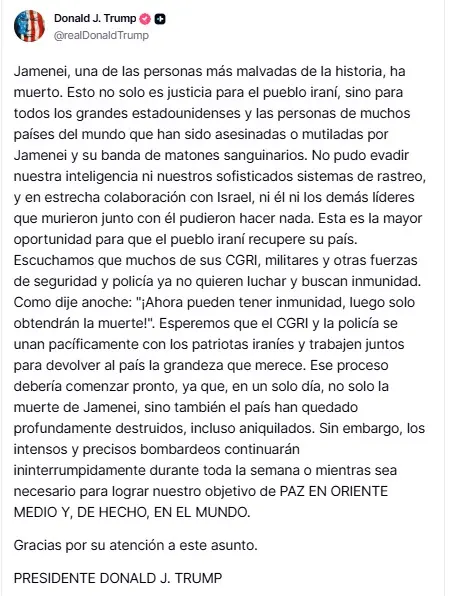 El presidente de Estados Unidos, Donald Trump, publicó en su cuenta de Truth Social que el líder supremo de Irán, Alí Jamenei, “ha muerto”.