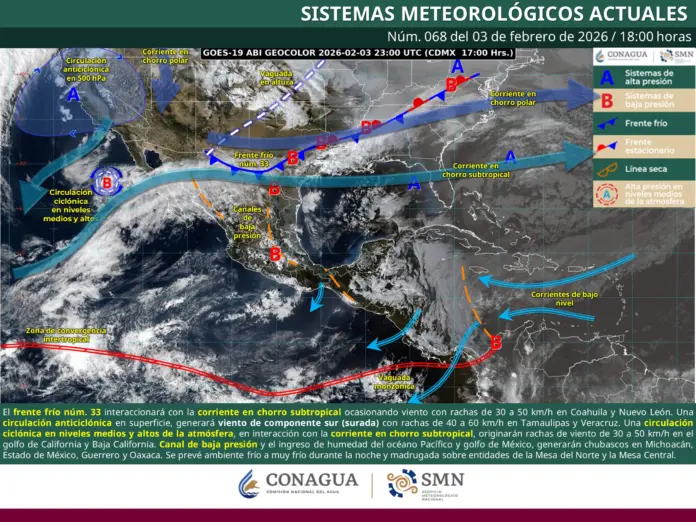 El frente frío 33 ya se desplaza por el norte, noreste y oriente de México y traerá consigo lluvias fuertes, vientos intensos, evento de Norte, descenso de temperaturas y hasta posible caída de nieve en zonas montañosas del país, de acuerdo con el pronóstico del Servicio Meteorológico Nacional.