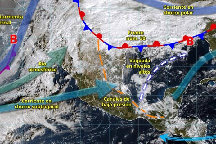 Además del frío, el arrastre de humedad generado por el río atmosférico provocará lluvias importantes en el occidente de México, mientras que el ingreso de humedad del océano Pacífico favorecerá lluvias y chubascos en el sur y sureste del país.