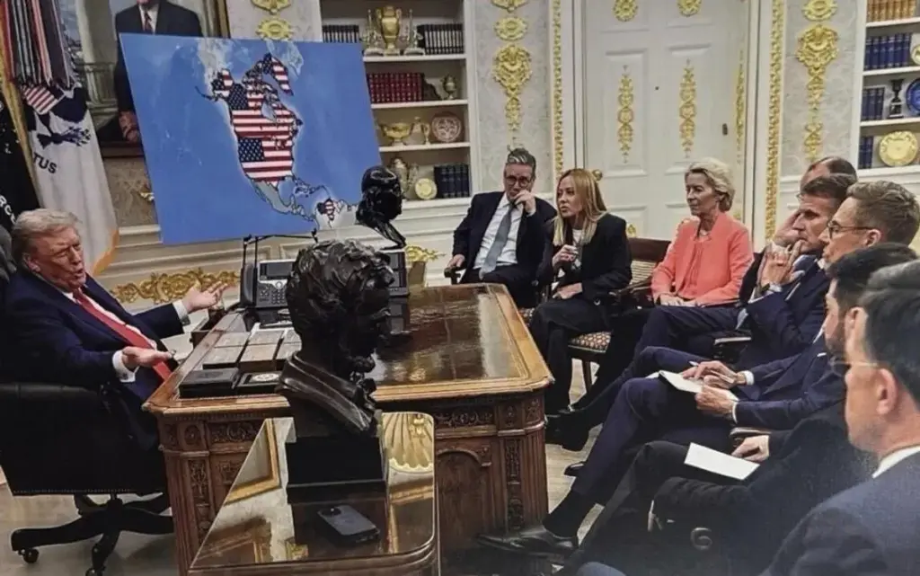 Las fotografías difundidas, que no fueron acompañadas con advertencias de que eran producto de IA, muestran en una de ellas una reunión en el Despacho Oval con líderes europeos mientras, al fondo, un mapa alterado exhibe la bandera estadounidense extendida sobre grandes regiones del continente americano. En otra, Trump aparece junto al vicepresidente J.D. Vance y al secretario de Estado Marco Rubio plantando una bandera estadounidense en Groenlandia con un letrero que dice “US Territory. Est. 2026”.